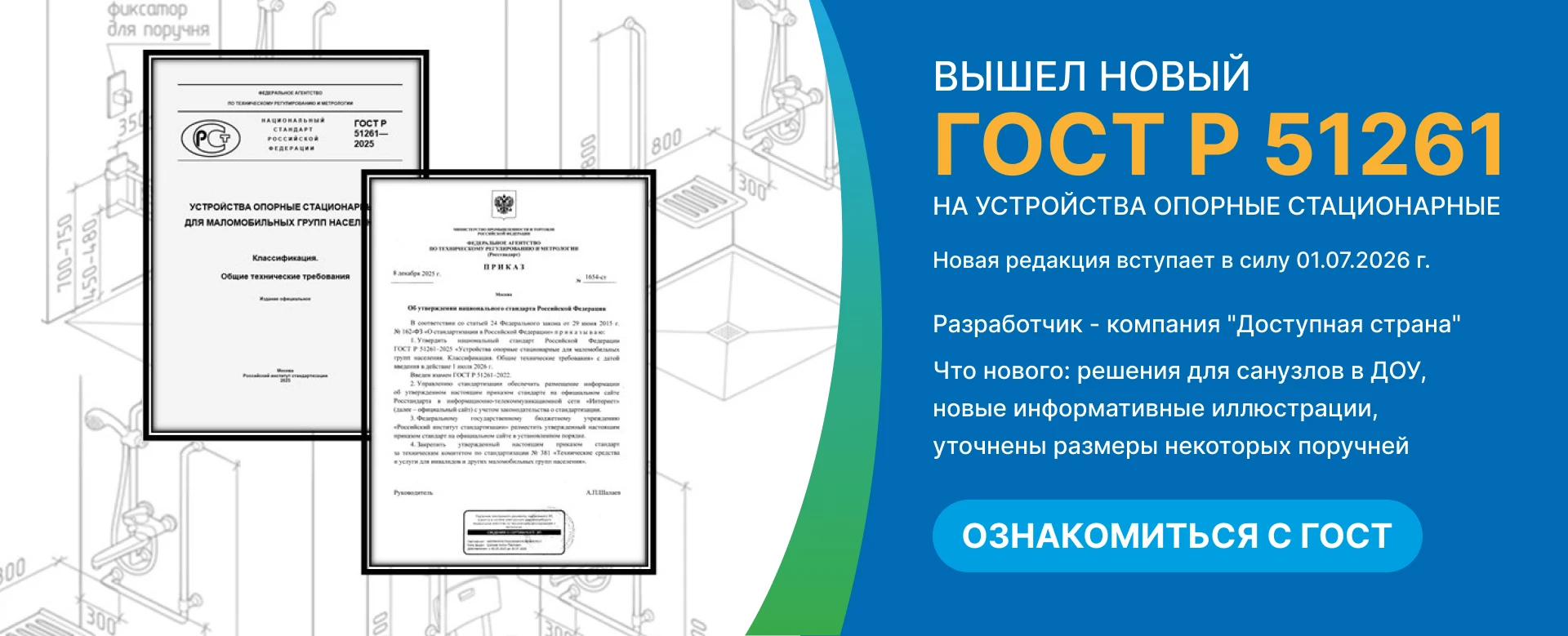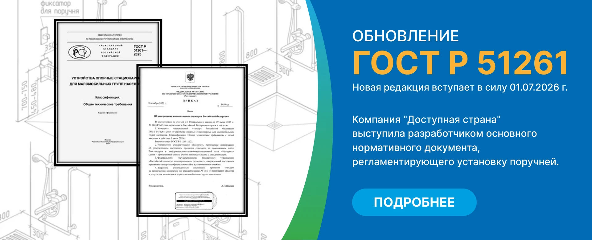 Компания "Доступная страна" - социальное предприятие. Мы не просто продаем оборудование по запросу - мы помогаем сформировать нормативно правильные пространства, доступные для МГН. Базой для правильного оснащения по доступной среде является проектирование. Мы бесплатно готовим чертежи с расстановкой оборудования для МГН, а также проверяем готовые проекты на соответствие нормам. Более 1550 бесплатных проектов уже выполнено нашим проектным отделом, и эта цифра неуклонно растет.