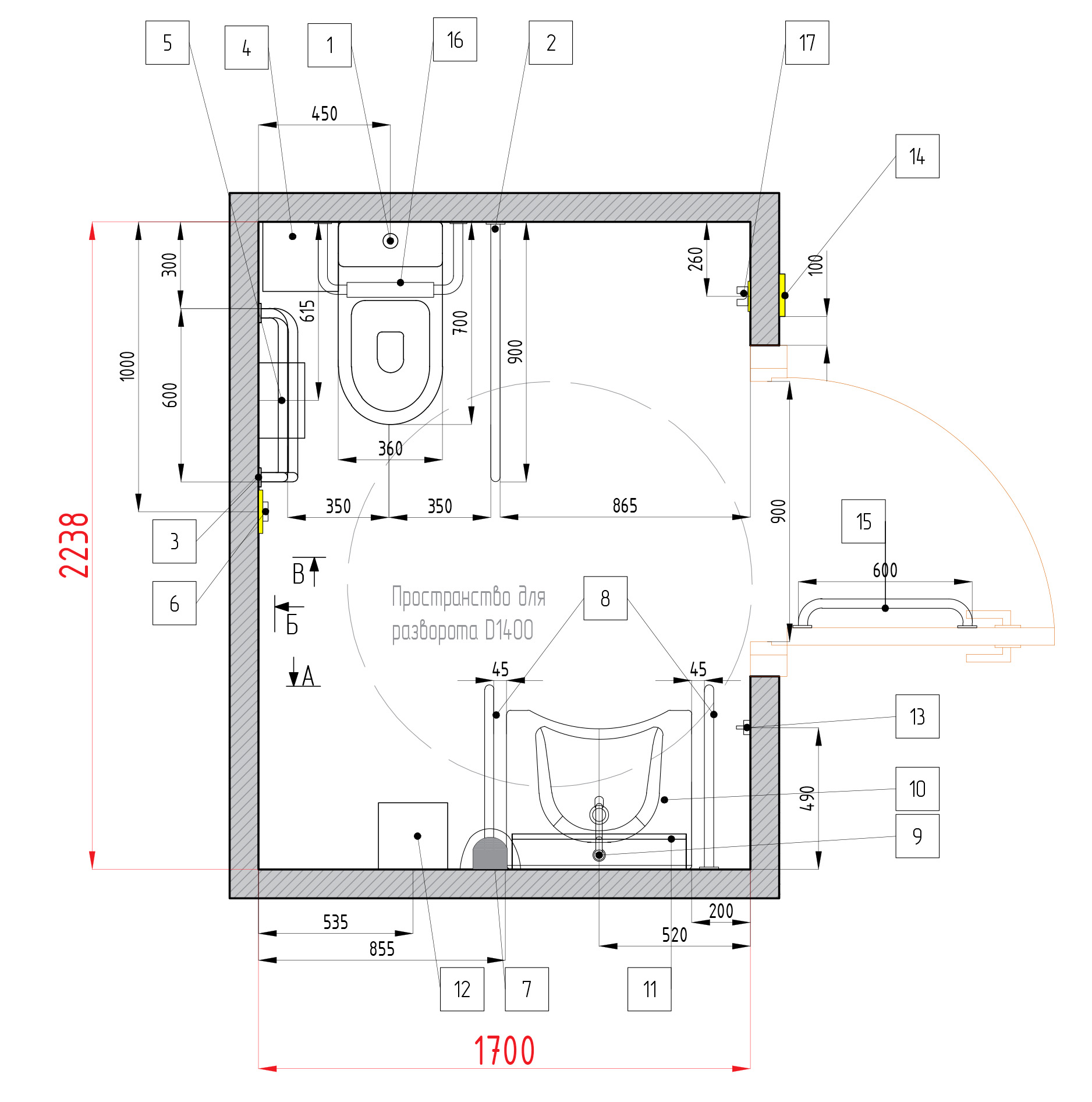 1. Универсальная кабина с угловым расположением унитаза (с напольным унитазом арт. 4620)
