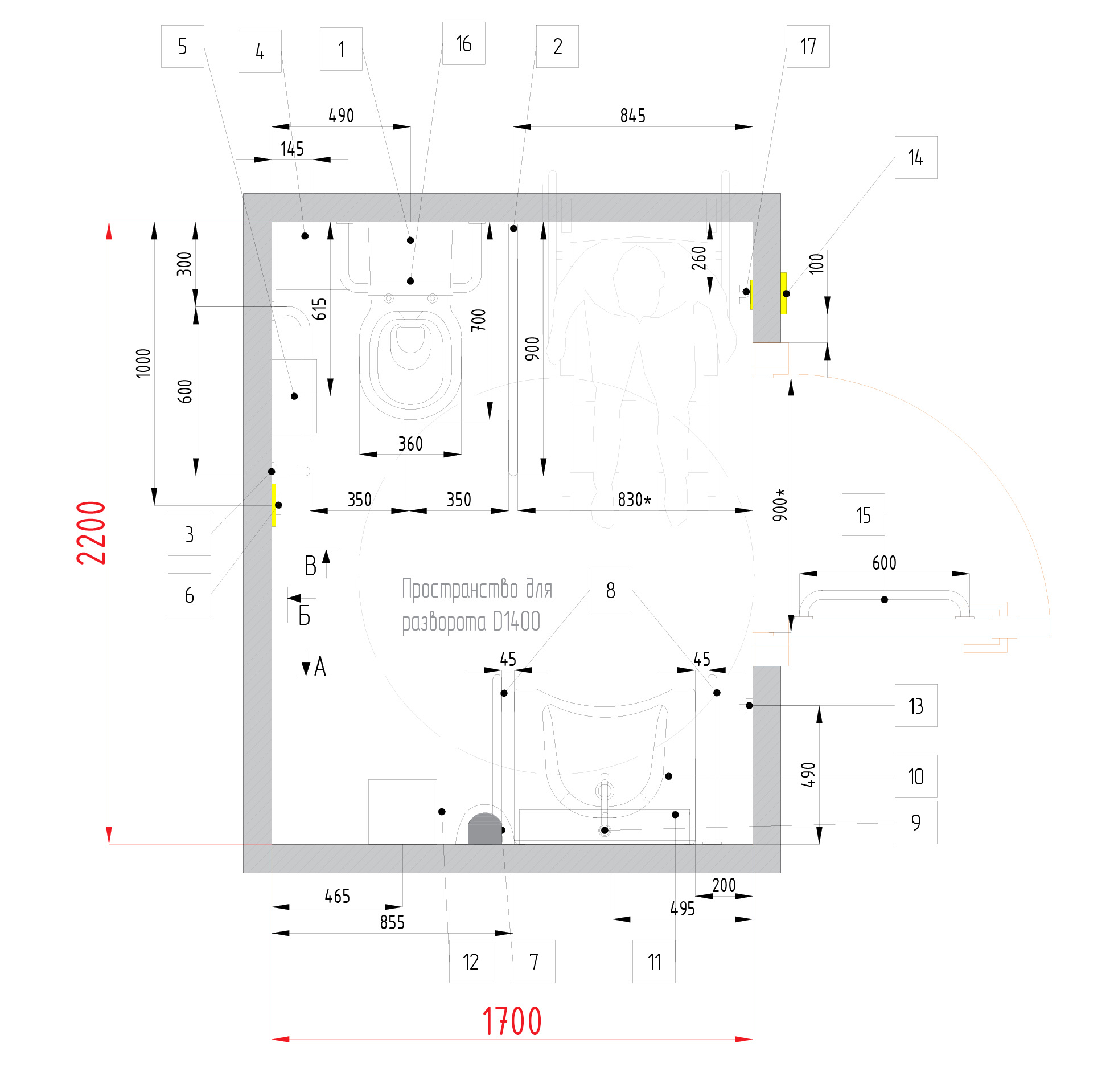 Габаритные размеры помещения: 1,7 х 2,2 м.