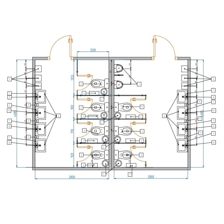 Оборудование: писсуары, унитазы компакт Виктория, механические диспенсеры для туалетной бумаги, урны для санузла с поворотной крышкой, сушилки для рук, умывальники, зеркала, смесители, антивандальные дозаторы для жидкого мыла.