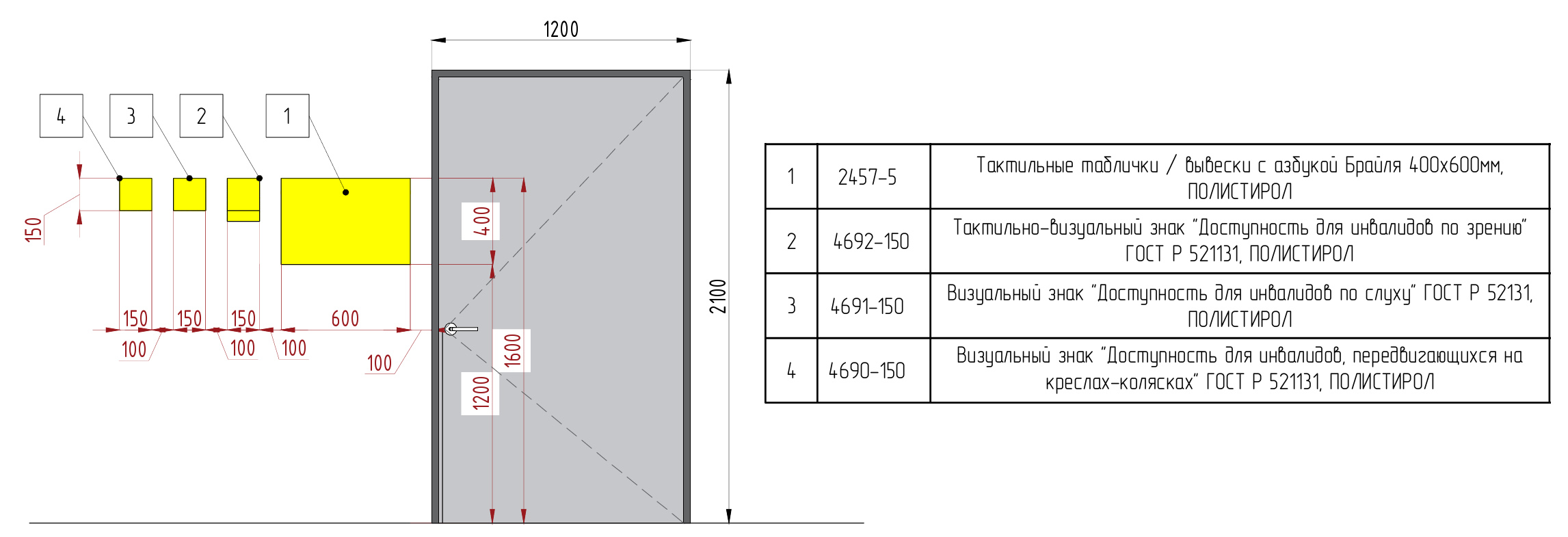 Вывески не размещаются на дверных полотнах, однако если дверь двустворчатая, и одна из створок не работает или редко используется, то размещение тактильной информации на неработающей створке допустимо.