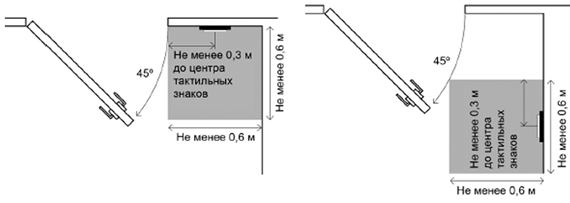 Если вход расположен близко к внутреннему углу, вывеску можно перенести на стену рядом с дверной ручкой вне зоны открывания двери и с сохранением свободного пространства для чтения тактильных знаков размером не менее 0,6 × 0,6 м.