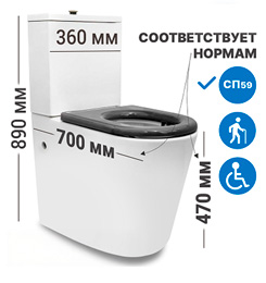 - Единственные российские унитазы для МГН, полностью соответствующие требованиям СП 59.13330.2020 — имеют увеличенную высоту чаши и длину.