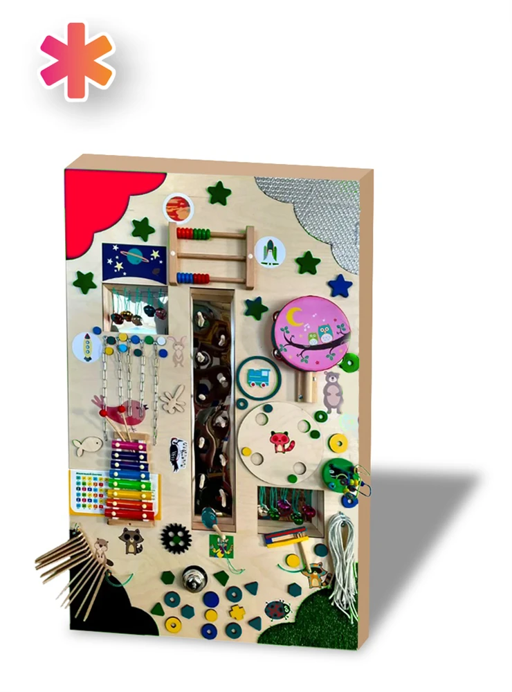 Большая панель "Мир Звуков"- это не просто разные поверхности и предметы, а еще и целый мир различных инструментов, изображений животных и геометрических фигур. На панели находятся колокольчики, металлофон, металлический звонок, бубенцы, маракасы, передвижные счеты, шестеренка и мягкие веревочки. Разные поверхности: мягкий коврик, колючий ковер и холодный, гладкий металл. На панели изображены разные животные, космос и цветные геометрические фигуры. Большая панель "Мир Звуков" заинтересует как маленьких детей, так и постарше, а родителям поможет сохранить дом в целости и сохранности. Акустическая тактильная панель Большая "Мир Звуков" будет верным другом родителей и подойдет для домашнего использования и для специальных учреждений.