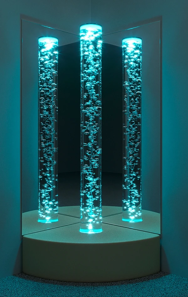 Комплект включает в себя мягкое основание под колонну, воздушно пузырьковую колонну диаметром 10 см. и высотой 150 см., либо диаметром 20 см. и высотой 200 см. и 2 настенных безопасных зеркала из зеркального пластика в профиле.