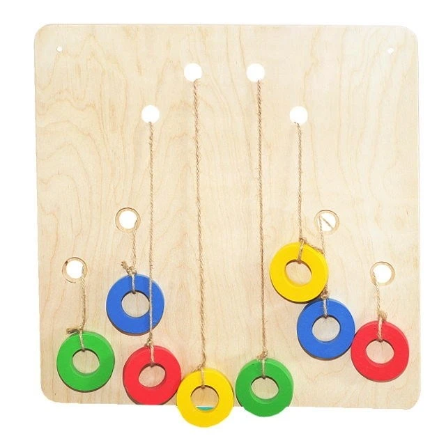 8 разноцветных колец, связаных попарно между собой, двигаются, если потянуть за кольцо. Задача: найти пару, потянув за кольцо.
