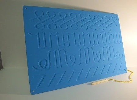 Использование панели улучшает координацию движений, тренирует плавность, развивает мышцы ладони и пальцев, а так же, прививают привычку правильного захвата ручки. Она позволяет отрабатывать написание криволинейных букв и плавное соединение их. Оснащена деревянным «карандашом».