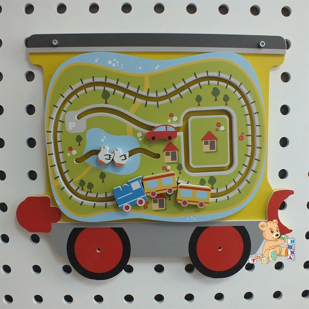 Настенная панель из серии "Паровоз". Настенный игровой элемент в виде вагончика снабжён подвижными фигурками уток, автомобиля и поезда с вагонами.
