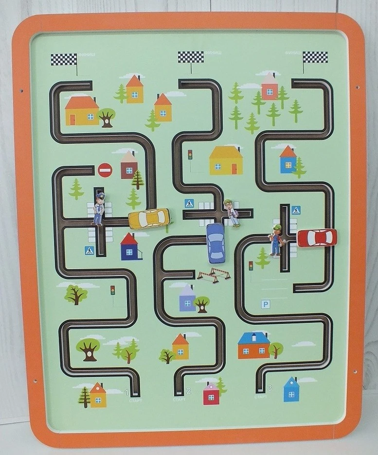 Игровое поле рассчитано на 3 игроков, машинки и фигурки человечков перемешаются по полю, способствуют развитию мелкой моторики.