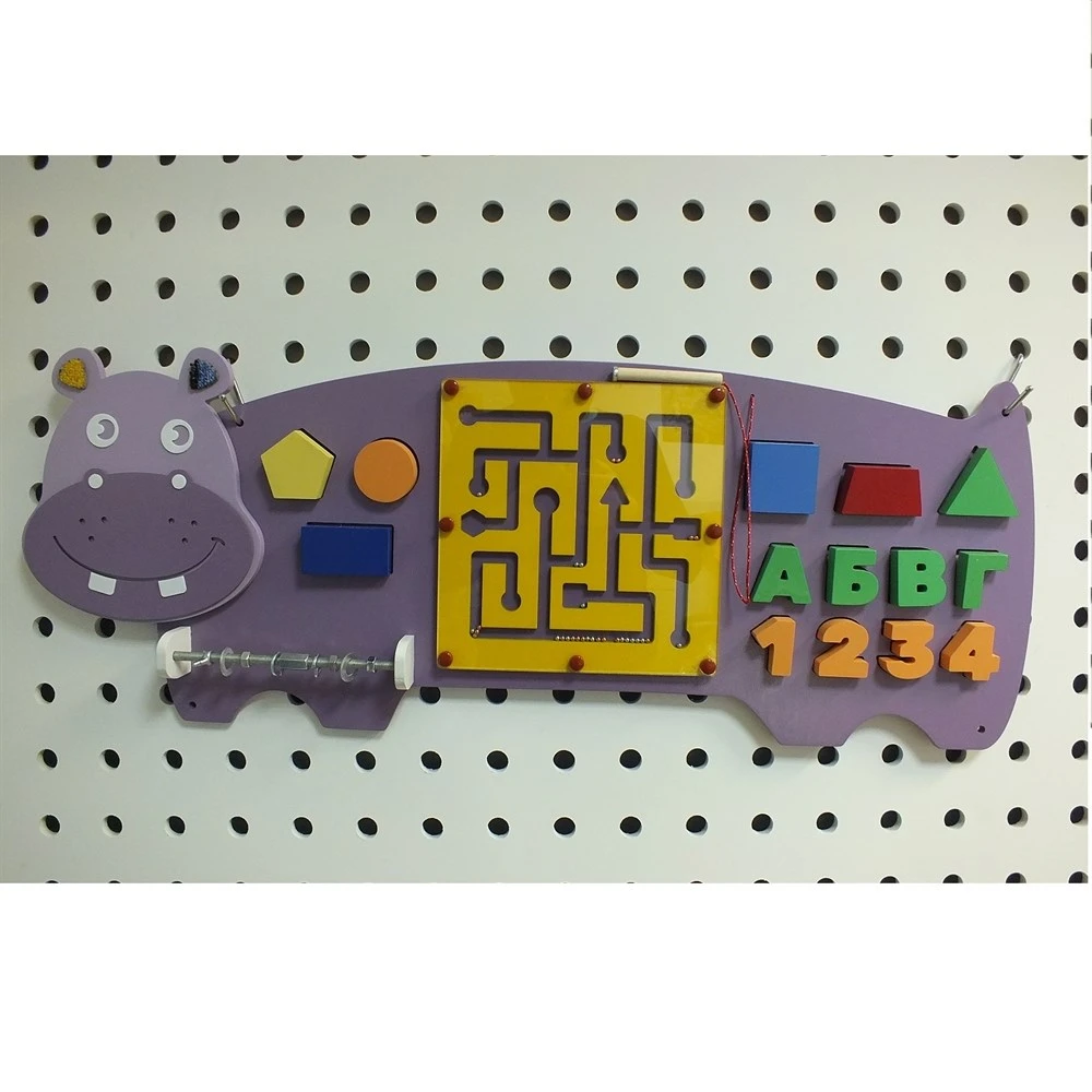 Бизиборд "Бегемот" - тактильная развивающая панель для детей дошкольного возраста. Развивает мелкую моторику, тактильные ощущения и цветовосприятие. Тактильная панель состоит из предметов, с которыми дети будут тренировать свои навыки по шнуровке ботинок, цветные пирамиды научат детей сопоставлять цвета, открывать и закрывать замочки.