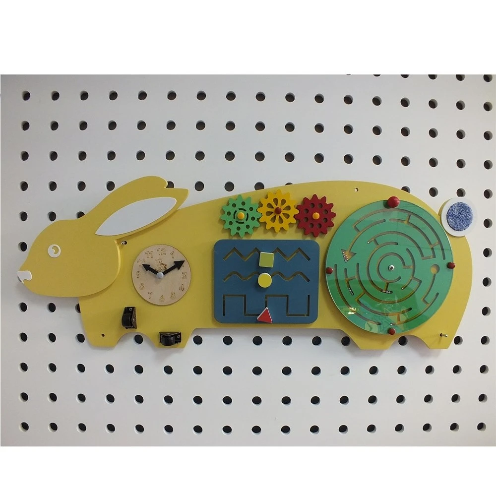 Бизиборд "Заяц" тактильная развивающая панель для детей дошкольного возраста. Развивает мелкую моторику, тактильные ощущения и цветовосприятие. Тактильная панель состоит из предметов, с которыми дети будут тренировать свои навыки по шнуровке ботинок, цветные пирамиды научат детей сопоставлять цвета, открывать и закрывать замочки.