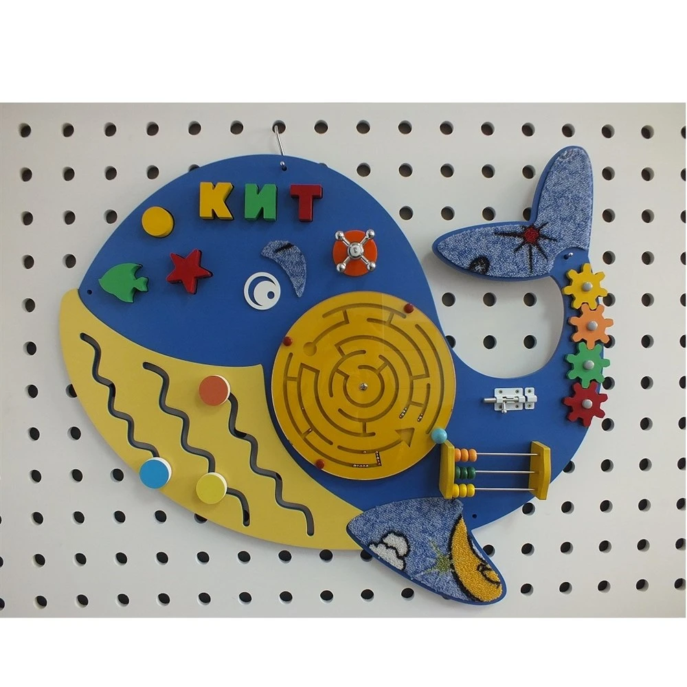 Бизиборд "Кит" станет отличным решением для оформления интерьера детского сада. Качественная панель с хорошо продуманным наполнением привлечет к себе всеобщее внимание. Панель выполнена в виде морского обитателя "Кита", с расположенными на ней элементами: