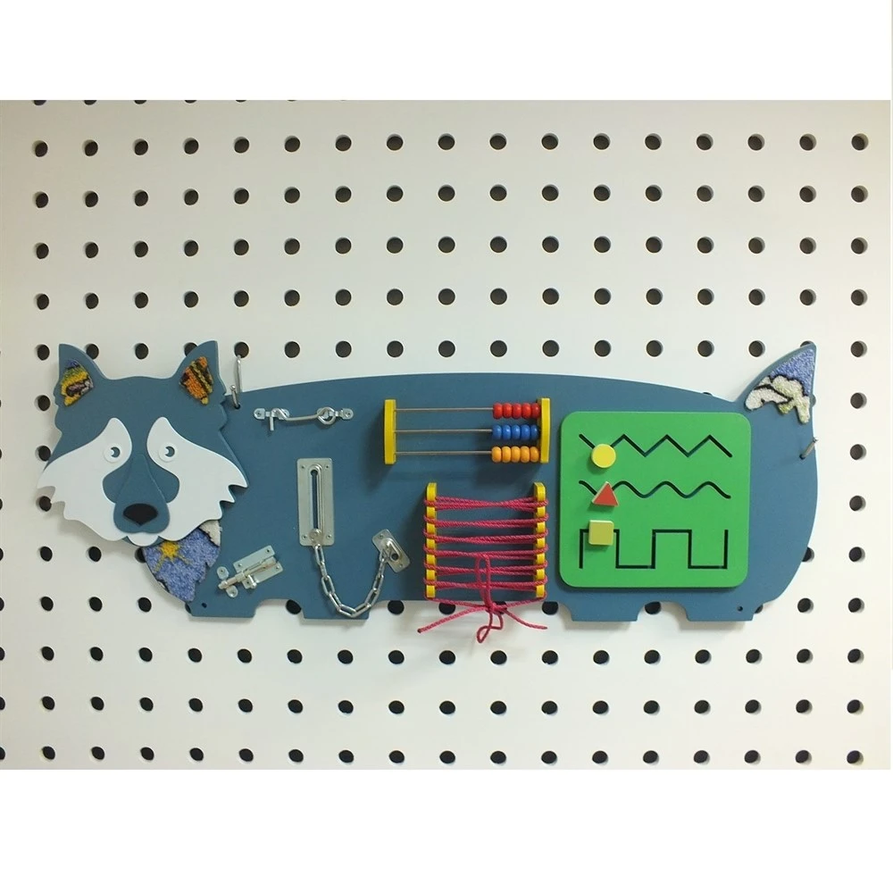 Бизиборд "Волчок" тактильная развивающая панель для детей дошкольного возраста. Развивает мелкую моторику, тактильные ощущения и цветовосприятие. Тактильная панель состоит из предметов, с которыми дети будут тренировать свои навыки по шнуровке ботинок, цветные пирамиды научат детей сопоставлять цвета, открывать и закрывать замочки.