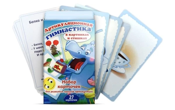 Мы подготовили 27 карточек с популярными артикуляционными упражнениями. На одной стороне написано название упражнения, стишок и инструкция по выполнению, на другой - картинка.