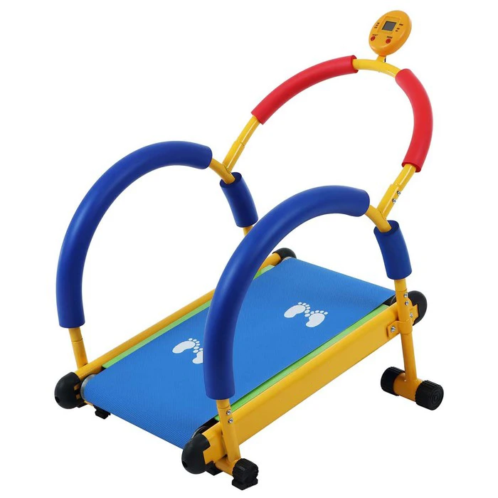 Детская беговая дорожка- совсем как настоящая, только маленькая. Ее трубы для безопасности покрыты мягким материалом.