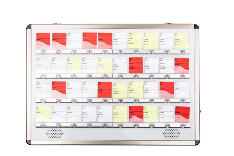 Беспроводной пульт (приемник) работает как приемник вызова, в комплекте есть блок питания. Предназначен для оперативного отображения вызовов, поступивших с кнопок. На пульте есть отделения для информационных карточек пациентов. Используется в сочетании со следующими устройствами: кнопки, приемники, уселитель.