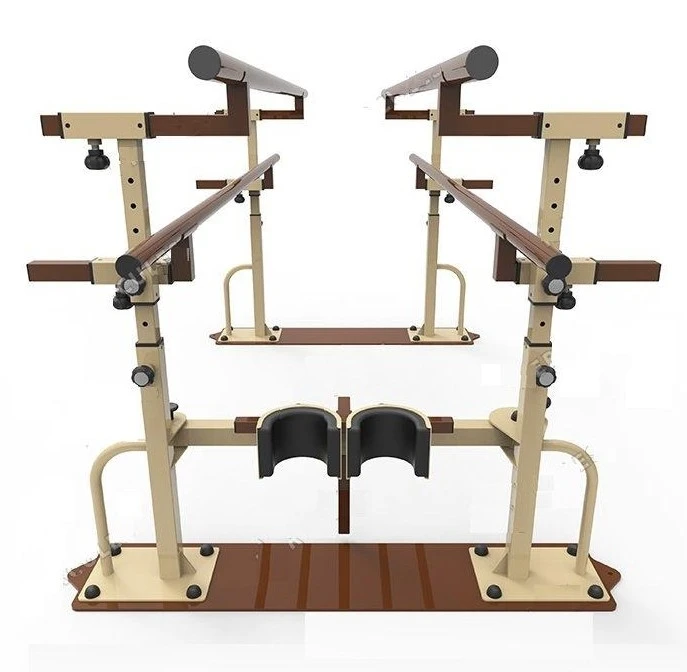 Брусья для реабилитации стационарные со съемными коленоупорами. Два уровня перекладин - верхние для подмышек, нижние - для удержания руками.