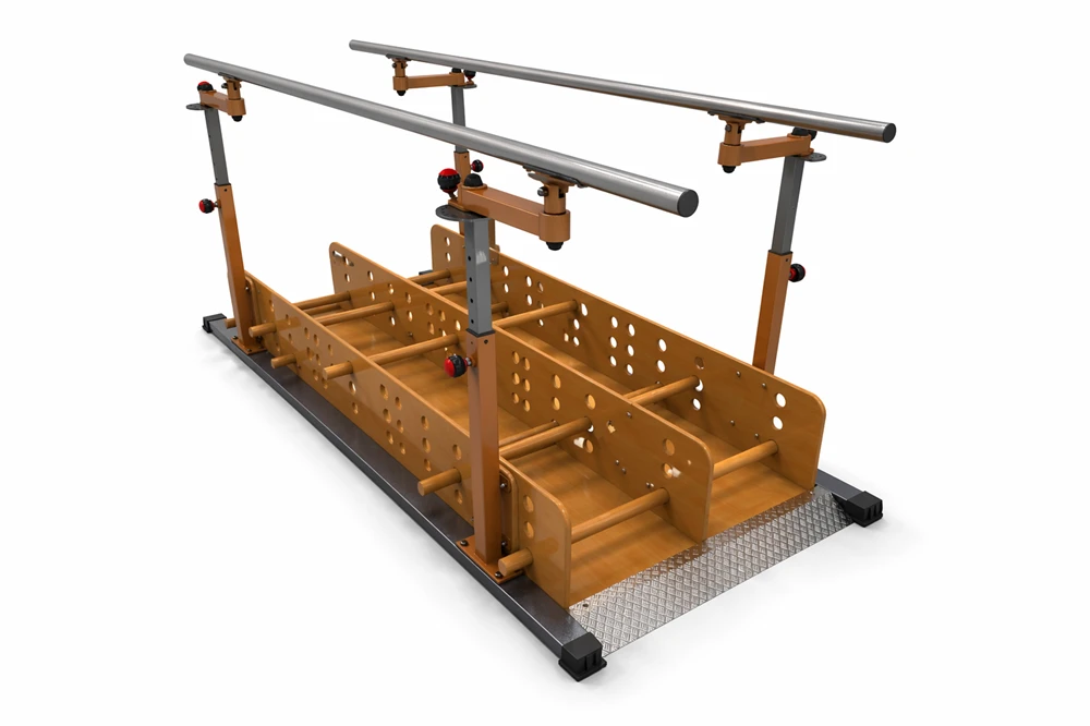 Конструкция включает параллельные поручни, регулируемые стойки и тренировочную дорожку с препятствиями. Пользователь может выполнять упражнения с опорой на поручни, постепенно повышая сложность занятий за счёт преодоления препятствий. Такая схема подходит для восстановления после травм, операций, неврологических нарушений и длительной гиподинамии.