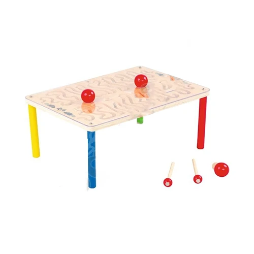 Предназначен для тренировки моторики, точности, концентрации. Выполнен из березовой фанеры. В столе, параллельно друг другу, выполнено два паза, представляющие собой извилистые линии. Пазы (их траектория) являются зеркальным (перевернутым) отражением друг друга. Поверхность стола (в том числе и пазы) закрыта оргстеклом. Шарики передвигаются по пазу с помощью ручек, имеющих магнитные свойства.
