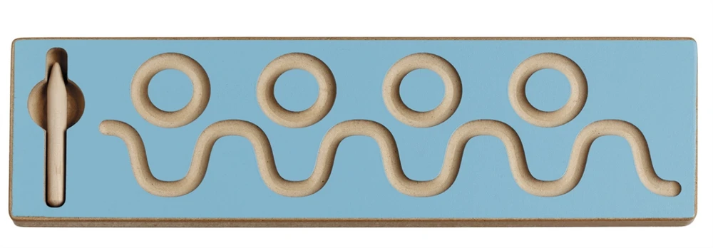В комплекте 2 деревянные доски размером 10х35х1,4 см с фигурными прорезями повторяющихся элементов, стилус. На каждой доске слева расположено углубление для хранения стилуса. Стилус должен иметь один конец зауженный, но не острый. Способствует подготовке руки к рисованию и письму, развитию моторики кисти руки, зрительно-моторной координации, наблюдательности, пространственного мышления, зрительного восприятия.