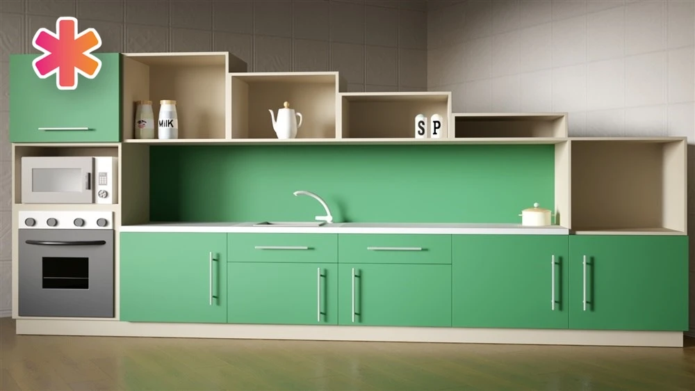 Верхний ярус кухни имеет красивую форму исполнения, которая, вне всяких сомнений, привлечет детское любопытство. Фасады окрашены в зелено-коричневоц сдержанной гамме, оттенены отдельными элементами белоснежного цвета. Вся детская кухня изготовлена из экологически чистых материалов высокого качества.