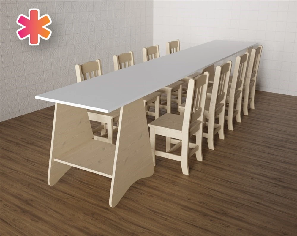 Детский стол «Вместе веселее» прекрасная находка для развивающих и творческих детских центров. Наш стол имеет восемь посадочных мест, что позволит проводить занятия сразу со всеми детьми. Сбоку стола есть полочка, где можно разместить книги и тетради. Стол прочный и устойчивый, даже непоседы могут чувствовать себя в безопасности. Если у вас многодетная семья, этот стол также для вас прекрасный вариант. Он с удовольствием послужит вашим помощником. Дизайн и цвет стола хорошо подойдут к любому интерьеру. К столу можно подобрать подходящие по дизайну стулья в нашем каталоге. Предназначен для детей от 3-х лет.
