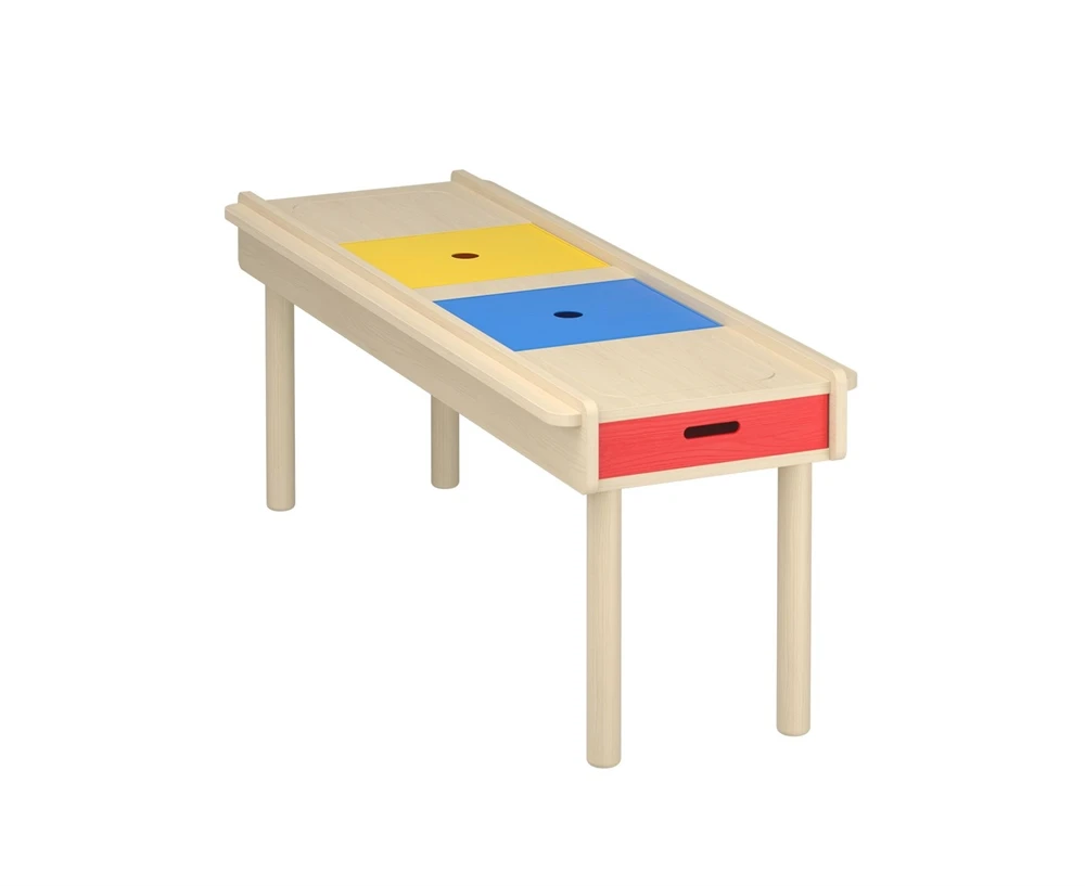 Дидактический стол высотой 600 мм для оснащения Центров игровой деятельности, конструирования и сенсорного развития в средних и старших группах детского сада. Конструкция представляет собой удлиненную столешницу с 4 дополнительными элементами: два выдвижных ящика в торцах и 2 ящика-углубления с крышками в центральной части. Такая конструкция позволяет использовать стол в качестве игровой зоны для занятий с дидактическими материалами, конструктором, мозаикой и настольными играми.