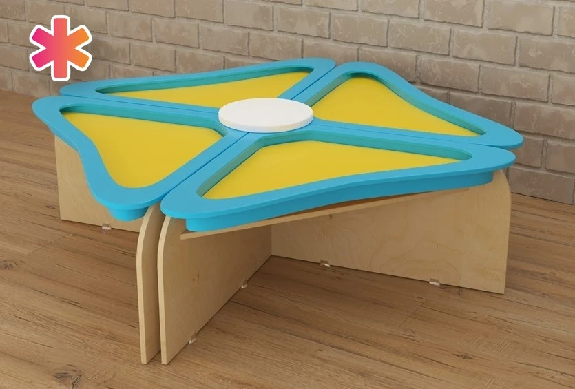 За счёт яркого дизайна и разнообразного наполнения этот детский игровой стол можно считать необходимым элементом оснащения пространства для занятий с детьми – ведь ребёнку гораздо приятнее заниматься и играть за таким необычным и красивым столом. Столешница выполнена в форме яркого небесно-голубого цветка, в каждой из 4-х частей имеются углубления (контрастного солнечно-жёлтого цвета), таким образом получается 4 отдельных игровых поля, на каждом из которых одновременно могут располагаться совершенно разные игры. Для чего нужно: Детские игровые столы широко используются для групповых и индивидуальных занятий с детьми дошкольного и младшего школьного возраста в детских садах и центрах раннего развития. Игровой стол “Василёк” подойдёт для занятий с небольшой группой детей, до 4-х человек.