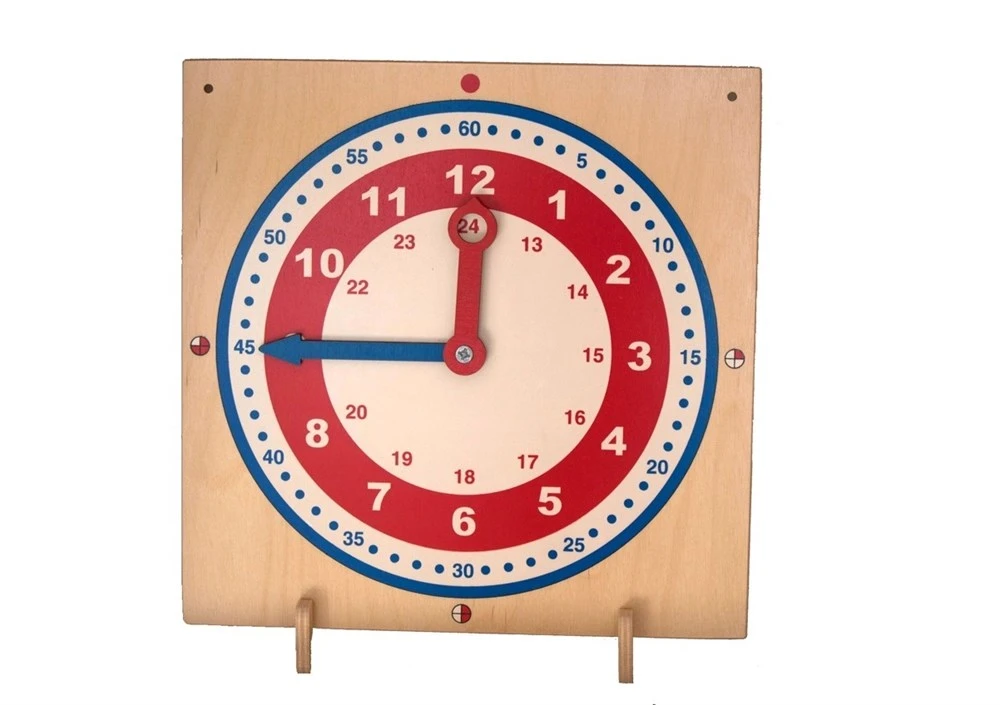 Дидактическое пособие «Часы» представляет собой деревянный планшет с вращающимися стрелками, на котором изображен циферблат, состоящий из двух окружностей: