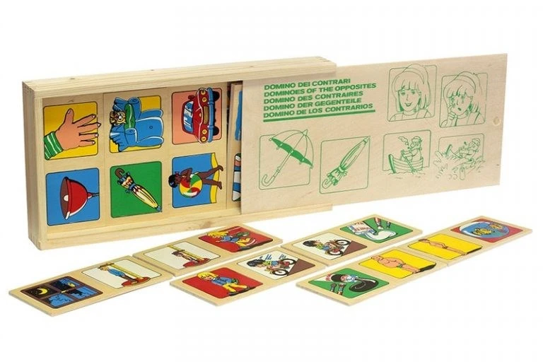 Игровой материал состоит из 20 фанерных карточек размером 15,5х7,5 см. в коробке. На каждой карточке по 2 картинки, изображающие знакомые детям предметы и явления.