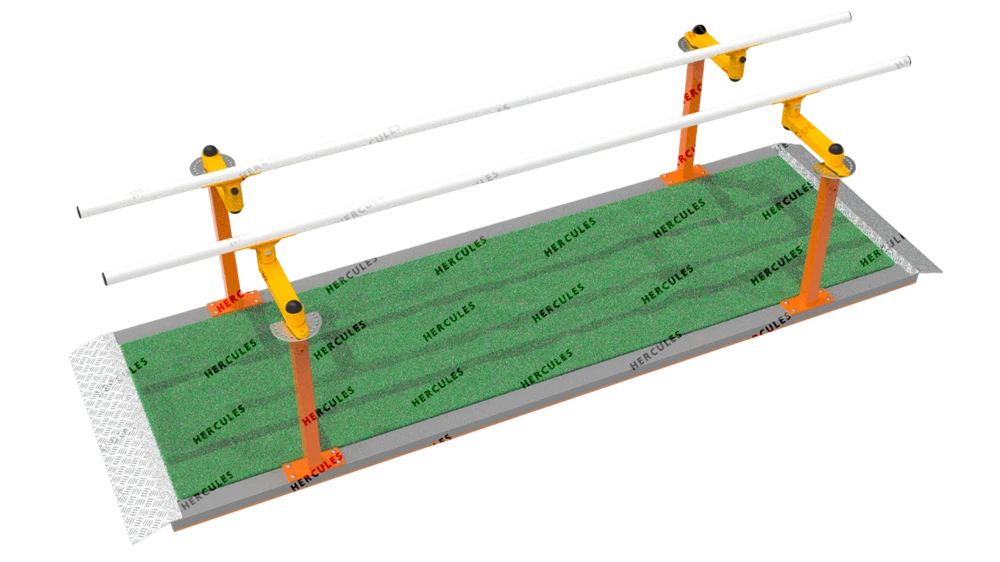 Конструкция представляет собой поверхность, оснащенную регулируемыми по высоте и ширине брусьями, установленными на пол, покрытой искусственной травой. Может быть изготовлена для использования на улице или в помещении. Материал: сталь с полимерно-порошковым покрытием, пол - влагостойкая многослойная фанера. Рама - стальная труба 80х40мм, 40х40мм; полоса 4х40мм; алюминиевый профилированный лист. Стойки - стальная труба 50х50мм, полоса 8х80мм. Перекладины - труба 42мм.