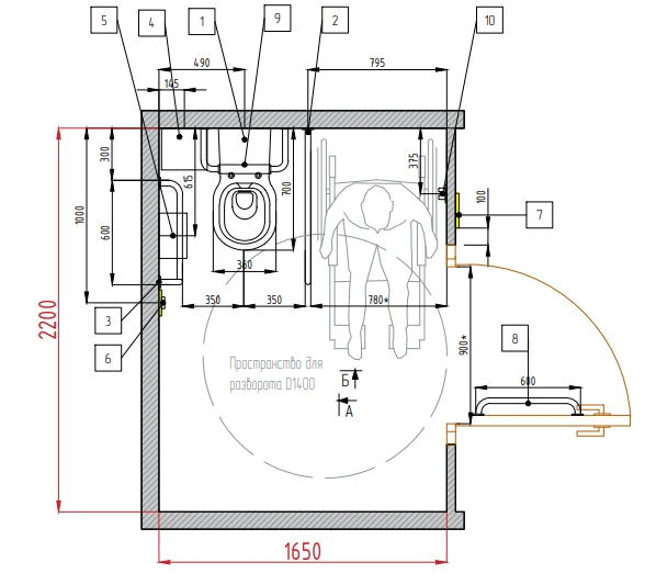 В соответствии с действующими нормами СП 59.13330.2020 санузел должен быть адаптирован для инвалидов специализированным оборудованием (все необходимое учтено в наборе!).