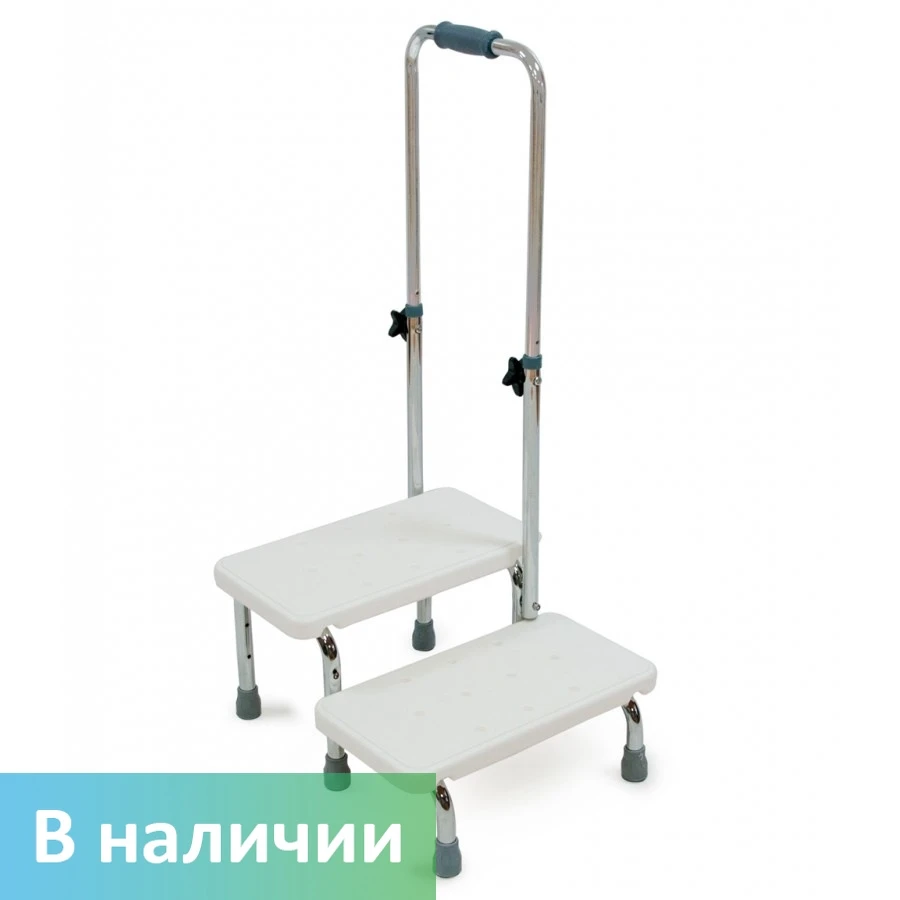Ступень предназначена для установки в ванные комнаты или душевые. Используется для безопасного принятия водных процедур: позволяет с комфортом погружаться в ванну и выходить из нее. Поручень закрепляется на ступени с правой или левой стороны. Ступени выполнены из высокопрочного рифленого пластика, устойчивого к воздействию воды. Поручень регулируется по высоте в трех положениях.