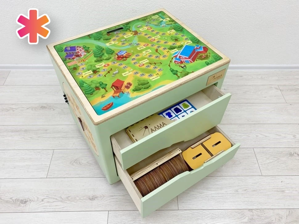 Мобильный куб на колёсиках может передвигаться в любое место класса, где детям удобнее заниматься, по бокам он оформлен бизибордами «Колесо настроения» и «Времена года», а сверху на крышке – красочная пошаговая игра-бродилка с вопросами на английском. Внутри в удобных ящиках спрятались: дидактические карточки, игра «Дубль», сортеры, пазлы, лото, домино, книга First Book.