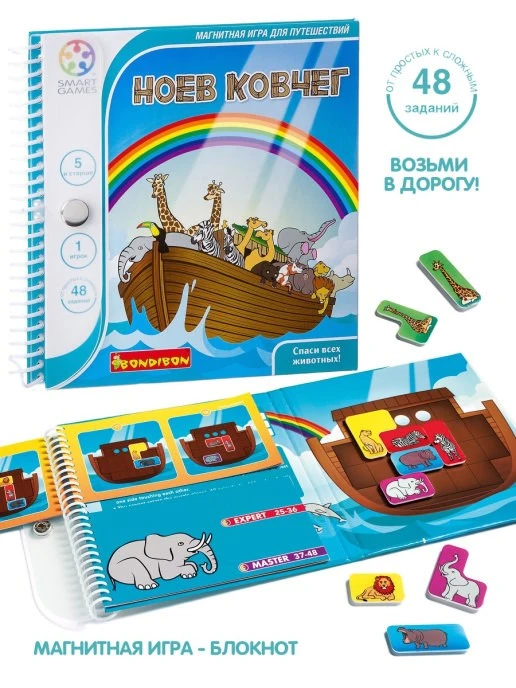 Яркая головоломка с игровой магнитной доской с магнитными деталями-пазлами содержит 48 заданий и 4 уровня сложности.