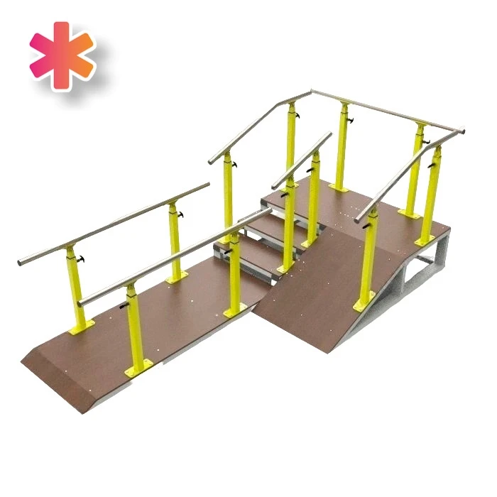 Стационарный модуль в виде наклонного пандуса (горки) с параллельными поручнями по обеим сторонам. Предназначен для безопасной отработки подъёма и спуска по наклонной плоскости с опорой руками, тренировки равновесия, переноса веса и координации. Геометрия пандуса и непрерывные брусья обеспечивают воспроизводимую, дозируемую нагрузку на разных этапах восстановления.