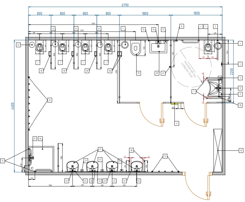 Готовый комплект оборудования для оснащения санузла совмещенного с кабиной для воспитателя и доступной кабиной для МГН в ДОУ (с подвесными унитазами)