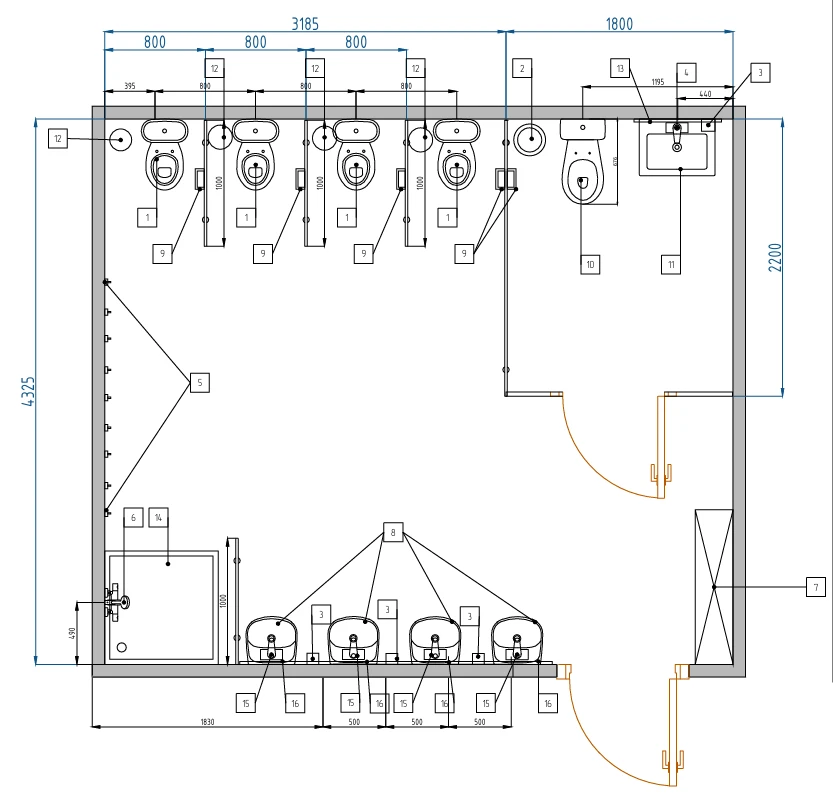 Готовый комплект оборудования для оснащения санузла совмещенного с кабиной для воспитателя в ДОУ (с напольными унитазами)
