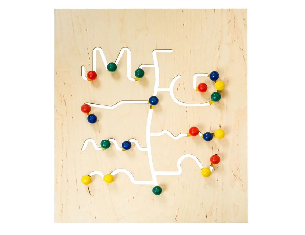 Двусторонняя неокрашенная панель стандартного размера с «экраном» 57х68 см. «Экран» с фигурными сквозными прорезями в виде волн, зигзагов, лабиринтов и т.д. Внутри прорезей помещаются 20 двойных подвижных цветных штырьков: 5 — красного, 5 — синего, 5 – зеленого, 5 — желтого цвета. Все штырьки имеют на противоположной стороне панели другую окраску. Игровая задача – собрать штырьки какого – либо одного цвета в определенное место – «депо», проведя их через все встречающиеся на пути препятствия. «Лабиринт» дает возможность развивать цветоразличение и тренировать мышцы кисти руки и лучезапястного сустава. Прорези на панели, по которым требуется провести цветные штыри, чтобы собрать в определенное место только одного выбранного цвета, имеют сложную систему изгибов и направлений. Кисть руки и лучезапястный сустав игрока при этом постоянно меняют положение, что развивает, тренирует и создает условия для подготовки руки к сложным действиям, в том числе — к письму. Когда на одной стороне панели штырьки окажутся рассортированными по цветам, на другой — в полном беспорядке, и их снова придется разводить по местам, сортировать.