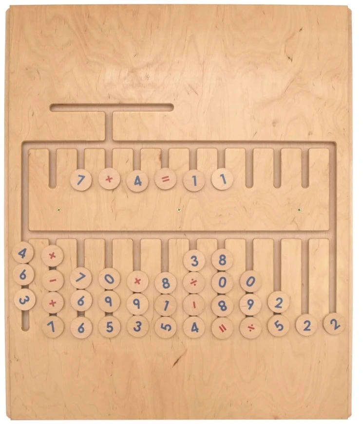 На другой — в прорезях находятся фишки с цифрами и арифметическими знаками, для составления и решения примеров.