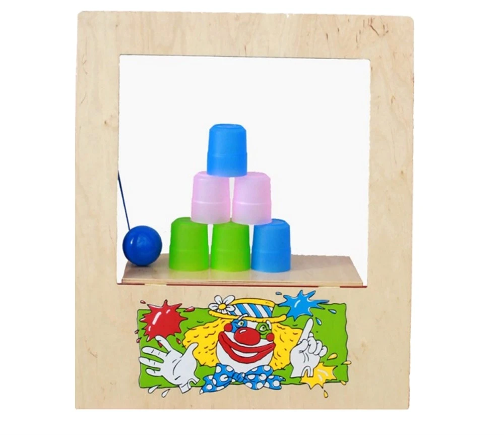 Панель стандартного размера с «экраном» 57х68 см. «Экран» с откидным «окном – стойкой», на стойке в виде полки помещаются легко сбиваемые «мишени» — 5 стаканчиков. В комплект входят 3 разноцветных пластиковых мячика для стрельбы по мишеням. Веселый, забавный клоун, изображенный снизу «экрана», словно приглашает к состязанию в меткости.