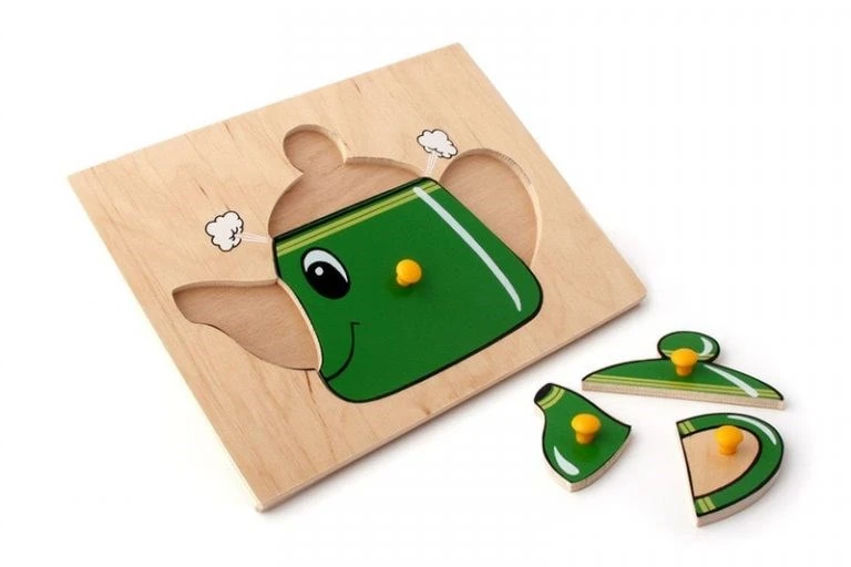Пособие предназначено для детей в возрасте от 2 до 6 лет. Расскажите малышу, для чего предназначен чайник, как называются составляющие его части, не забудьте предупредить о мерах безопасности при обращении с горячим чайником. Спрячьте один из пазлов и попросите ребенка найти и починить чайник, детям старшего возраста можно предлагать придумать о нем загадку.