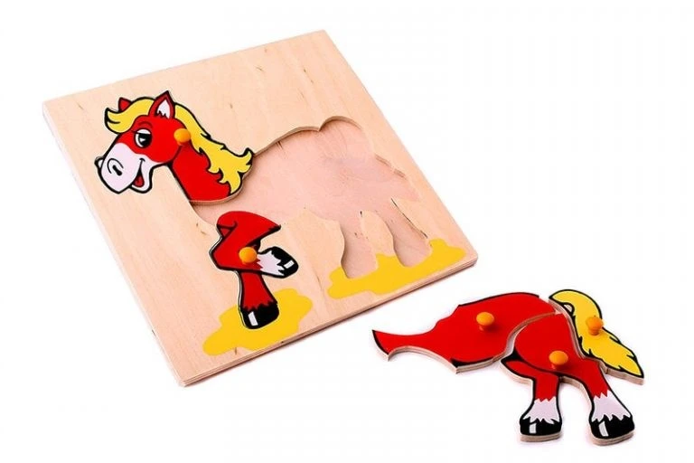 Деревянный планшет размером 24х24 см, на котором изображена разборная картинка, состоящая из пяти элементов, к каждому из которых прикреплена удобная ручка.