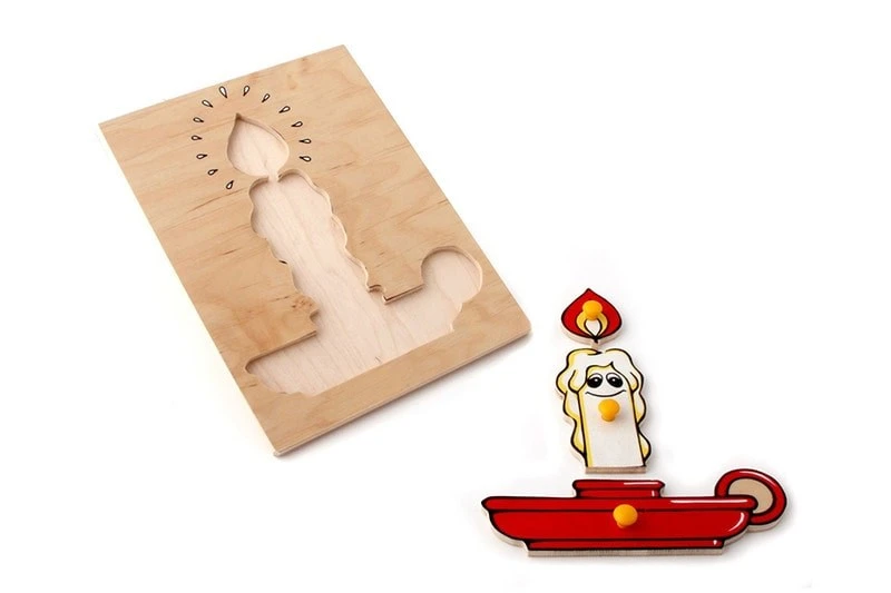 Мозаика представляет собой деревянный планшет размером 24х18 см, на котором размещены 3 вкладыша-пазла, изображающих свечу. Каждая часть снабжена для удобства ручкой-кнопочкой. Мозаика развивает мелкую моторику, внимание, память и логическое мышление ребенка.