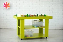Каркас сделан из ЛДСП насыщенного зеленого цвета. Высокие бортики не дадут игрушкам упасть с поверхности. Под столешницей есть две полки, доступ к которым имеется с четырех сторон. На ножках установлены поворотные колеса, поэтому конструкцию легко передвигать с место на место.
