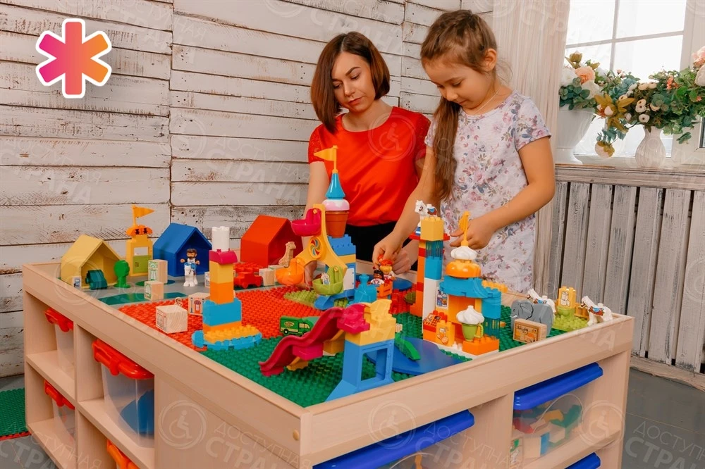 Данный стол – это комбинация игрового стола №2 и №3. Он идеально подходит как для малышей, так и для детей младшего школьного возраста. Подобное устройство позволяет детям выстраивать разнообразные ролевые ситуации, создавая свой уникальный дизайн с машинами, деревьями, транспортом, фигурками людей и животных.