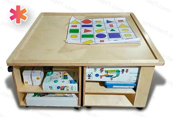 Поскольку стол достаточно широкий, на нем можно проводить занятия сразу со многими детьми, подойти к нему можно со всех сторон. Для обсуждения творческих идей, во время групповых уроков, за столом дети тренируют свои речевые навыки. Наборы, входящие в комплект,позволяют тренировать моторику рук, улучшается координация движений и появляется первичный навык концентрации внимания.
