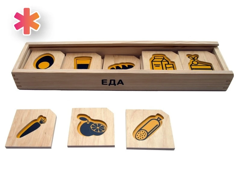 Набор включает: пенал со сдвигающейся крышкой, в котором находятся 20 карточек для альтернативной коммуникации: чай, вода, сок, молоко, каша-суп, второе, хлеб, булка, колбаса, яйцо, сыр, апельсин, яблоко, банан, морковка, груша, конфета, печенье, торт, пицца, гамбургер.