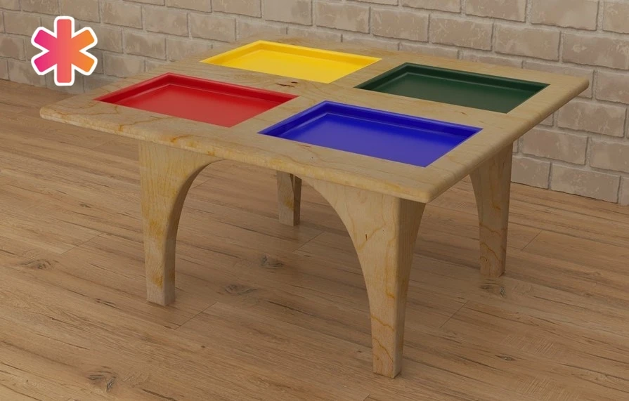 Игровой стол для занятий сенсорной интеграцией “4 цвета” имеет лаконичный дизайн – основание имеет натуральный цвет древесины, а игровые пространства-углубления окрашены каждое в свой цвет (красный, жёлтый, синий и зелёный). Благодаря высокому полезному потенциалу детский игровой стол можно считать необходимым элементом оснащения пространства для занятий с детьми – его внешний вид и разнообразное применение поможет превратить обычное занятие в весёлую игру. Для чего нужно: игровой стол для занятий сенсорной интеграцией предназначен для групповых и индивидуальных занятий с детьми дошкольного и младшего школьного возраста в детских садах и центрах раннего развития.