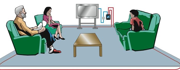 Решение подходит для небольших помещений с зоной для просмотра ТВ. Звук идет от ТВ в индукционную петлю и передается на слуховой аппарат слабослышащего. Для использования системы, слабослышащему достаточно переключить свой слуховой аппарат в режим индукционной катушки «Т».